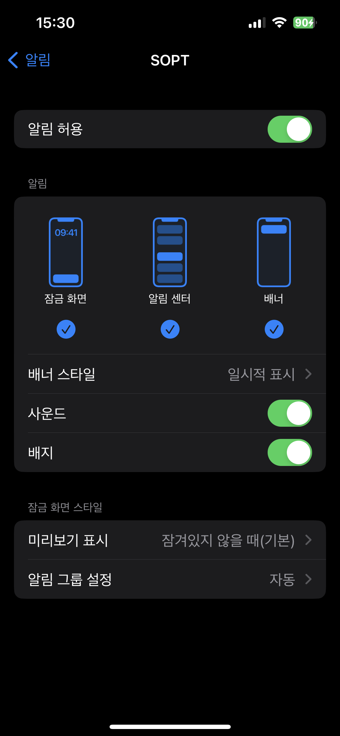 사용자는 알림 설정에서 배지를 표시하도록 허용할지 여부를 선택할 수 있다.