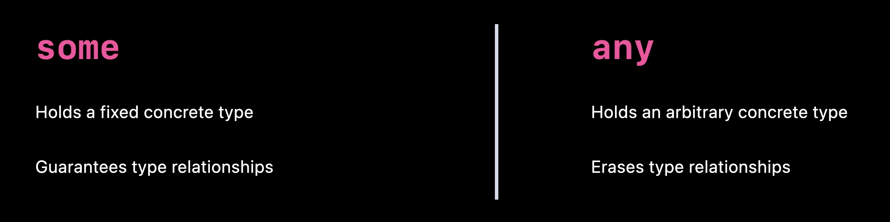 var myCar: some Vehicle = Car() myCar = Bus() // 🔴 Compile error: Cannot assign value of type 'Bus' to type 'some Vehicle' var myCar: some Vehicle = Car() myCar = Car() // 🔴 Compile error: Cannot assign value of type 'Car' to type 'some Vehicle' var myCar1: some Vehicle = Car() var myCar2: some Vehicle = Car() myCar2 = myCar1 // 🔴 Compile error: Cannot assign value of type 'some Vehicle' (type of 'myCar1') to type 'some Vehicle' (type of 'myCar2')// ✅ No compile error let vehicles: [some Vehicle] = [ Car(), Car(), Car(), ] // 🔴 Compile error: Cannot convert value of type 'Bus' to expected element type 'Car' let vehicles: [some Vehicle] = [ Car(), Car(), Bus(), ] // 여기서 some Vehicle로 제한을 하고 Car라는 특정한 하나의 타입으로 컴파일 시에 확정이 되었기 때문에 // Bus는 어레이에 들어갈 수 없다.// ✅ No compile error func createSomeVehicle() -> some Vehicle { return Car() } // 🔴 Compile error: Function declares an opaque return type 'some Vehicle', but the return statements in its body do not have matching underlying types func createSomeVehicle(isPublicTransport: Bool) -> some Vehicle { if isPublicTransport { return Bus() } else { return Car() } } // 같은 원리로 함수의 리턴 타입으로 some을 사용했을 때 하나의 구체 타입만 리턴 할 수 있다!!