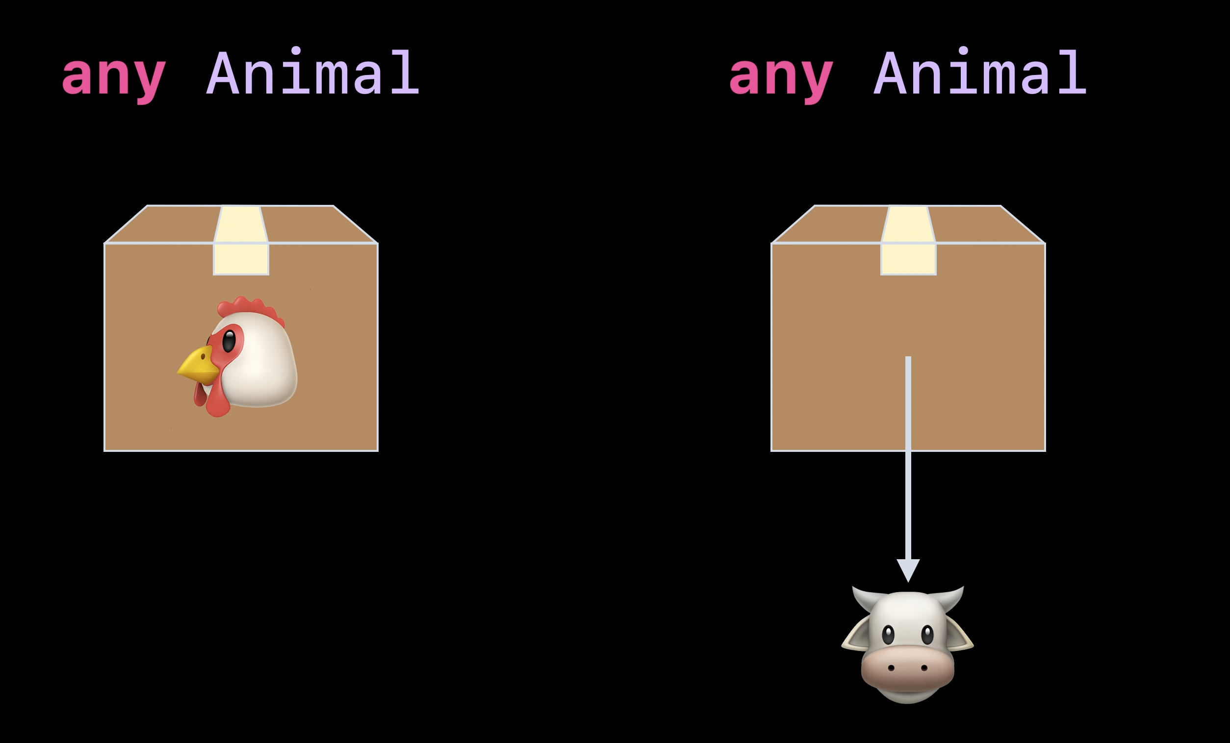 // ✅ No compile error when changing the underlying data type var myCar: any Vehicle = Car() myCar = Bus() myCar = Car() // ✅ No compile error when returning different kind of concrete type func createAnyVehicle(isPublicTransport: Bool) -> any Vehicle { if isPublicTransport { return Bus() } else { return Car() } } // 🔴 Compile error in Swift 5.6: protocol 'Vehicle' can only be used as a generic constraint because it has Self or associated type requirements // ✅ No compile error in Swift 5.7 let vehicles: [any Vehicle] = [ Car(), Car(), Bus(), ]