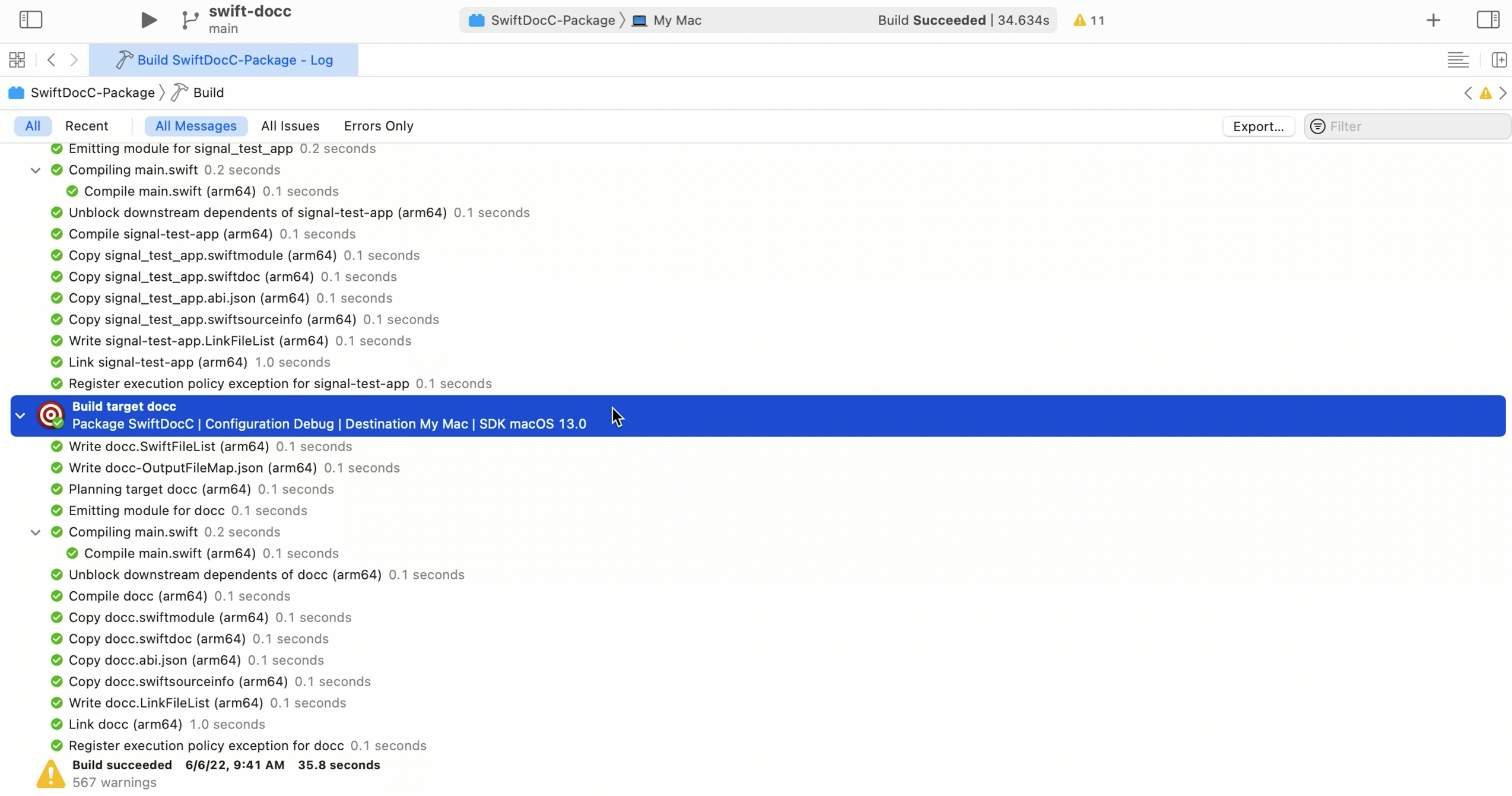 - 각 타겟에 대한 최상위 Swift 드라이버 작업 빛 각 타겟의 개별 하위 작업이 타임라인에 나타나있다. (위 사진)
