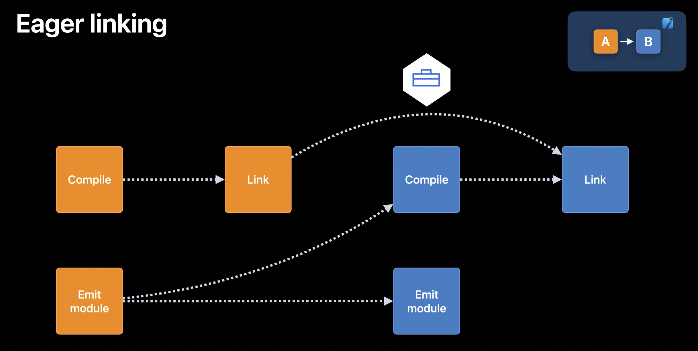 - Eager linking를 사용하면 타겟 B의 링크 작업이 타겟 A의 emit-module 작업에 의존할 수 있다.